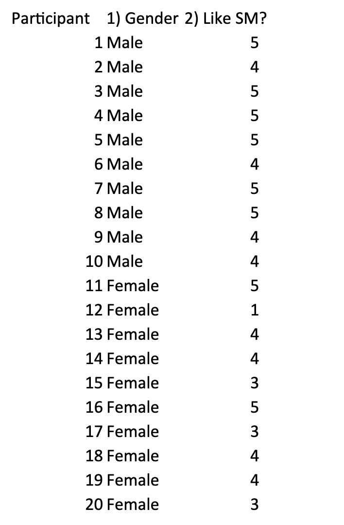Solved Participant 1) Gender 2) Like SM? 1 Male 5 2 Male 4 3