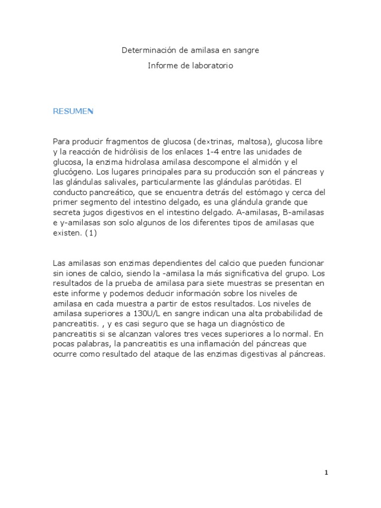 Informe de Laboratorio de Amilasa en Sangre PDF Especialidades Medicas