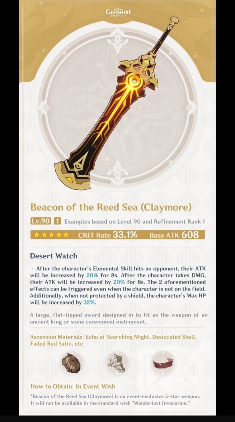 It provides atk, crit rate and hp. It increases atk and max hp when. Beacon of the reed sea is a claymore weapon for dehya and other dps characters.