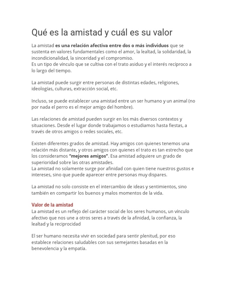 Qué Es La Amistad y Cuál Es Su Valor en Español PDF Amistad Amor