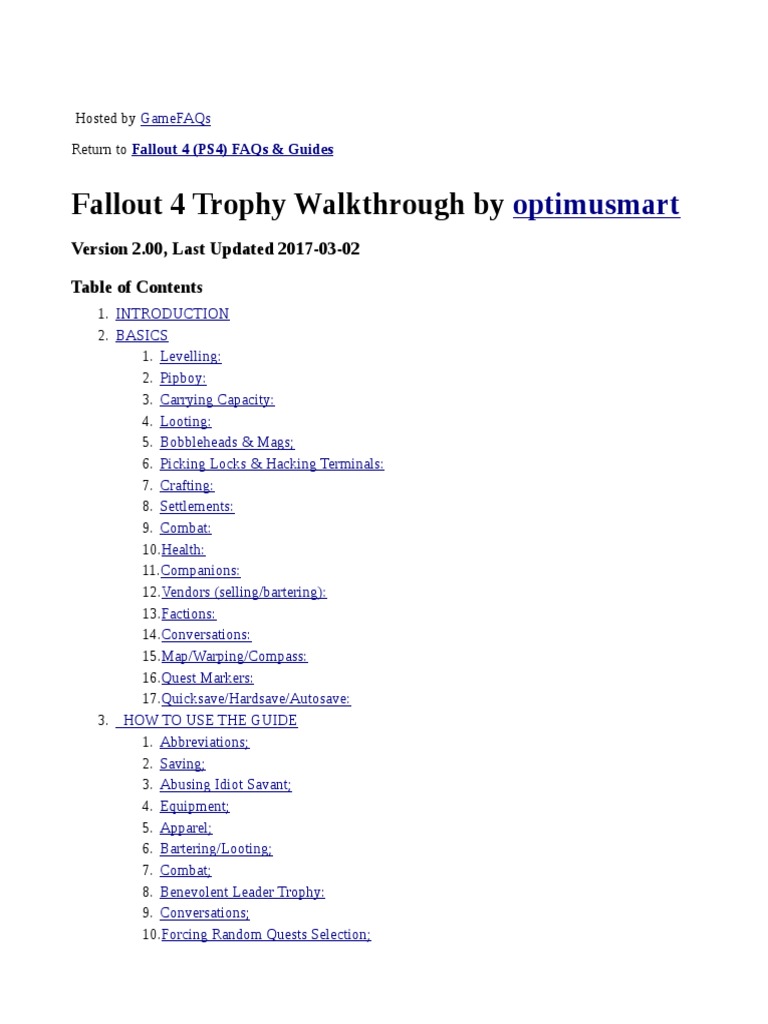 This guide provides detailed instructions on how to navigate fallout 4 and earn the platinum trophy. Also included are all bobblehead locations, companions, holotape game and more. Diebrarian collect every issue of scav! Fallout 4 trophy guide contains tips for trophies and collectible locations. Everything else on the list is your typical open world type trophy/achievement list.