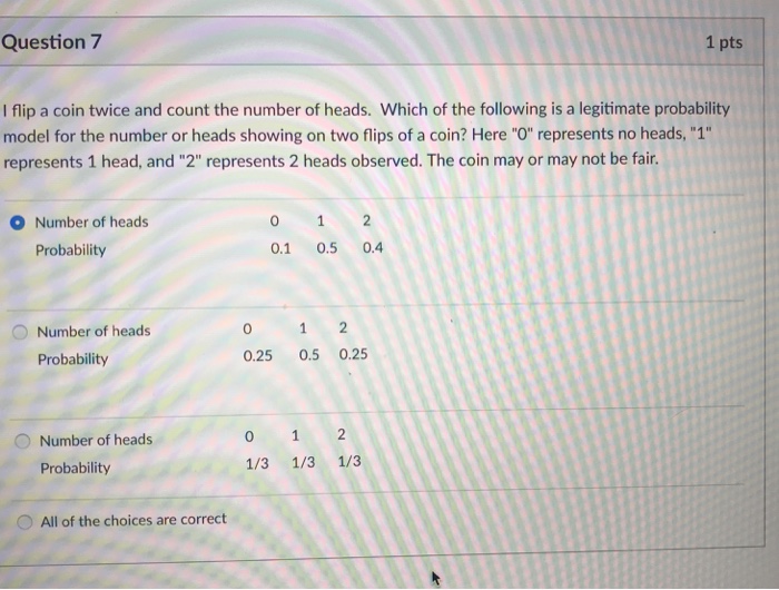 Solved Question 7 1 pts I flip a coin twice and count the