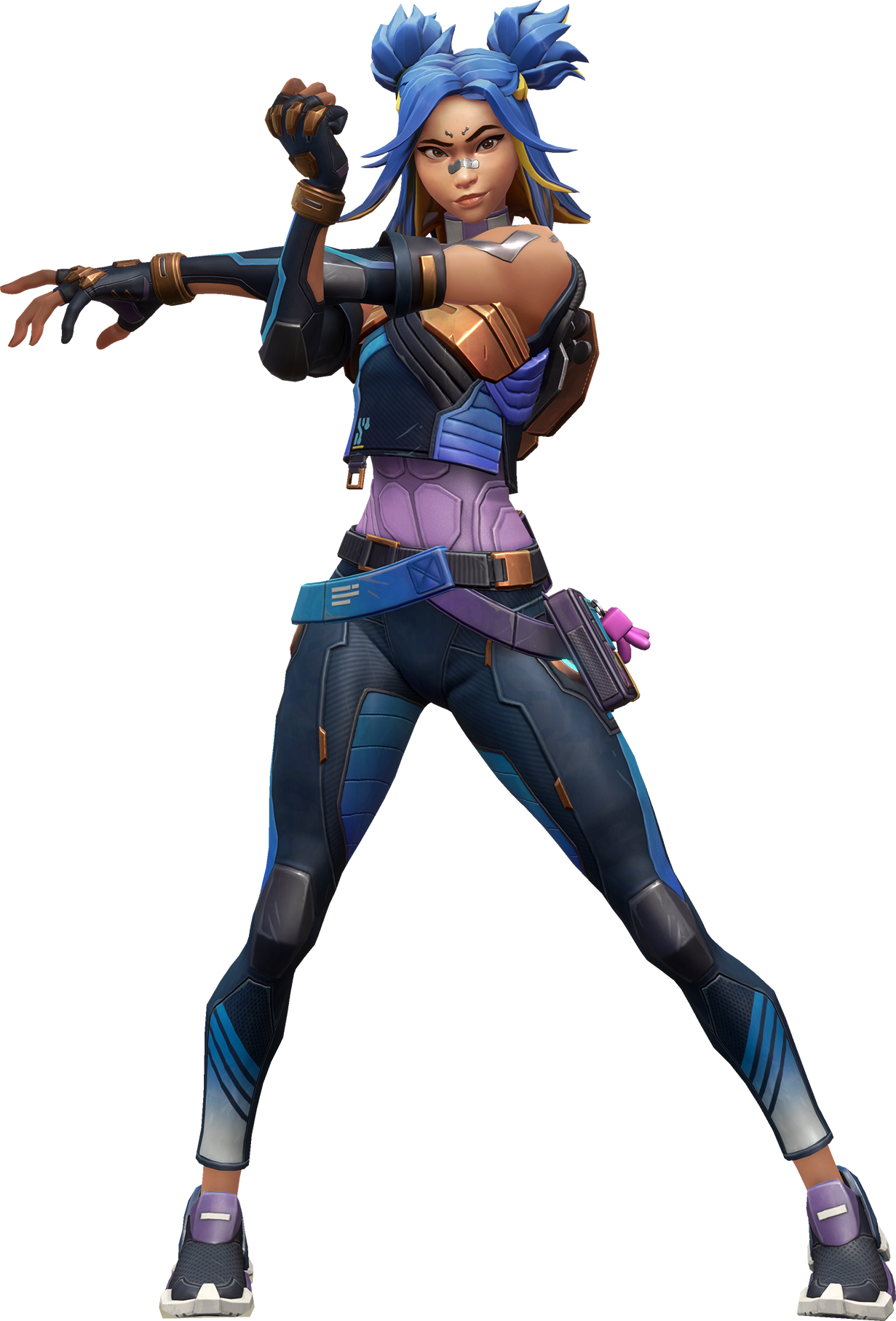 Neon is a young filipina woman with olive skin and a short stature. Her presence in the game is much larger than her physical height. She sports an athletic attire with black and blue running leggings along with. The speedy zoomster sits at 5’4″.