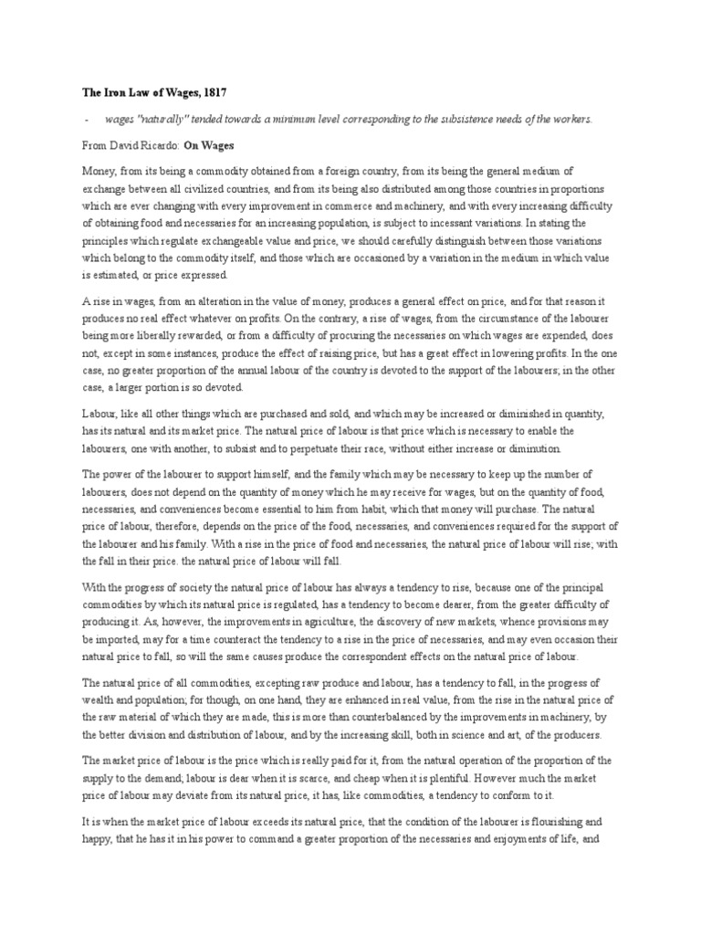 Iron law of wages published on by oxford university press. The iron law of wages. Early in the 19 th century, david ricardo enunciated the iron law of wages. There is no particular moment when ricardo “released” the iron law of wages, as with an album or novel, but we know generally when. A doctrine imputed by *marx to the.