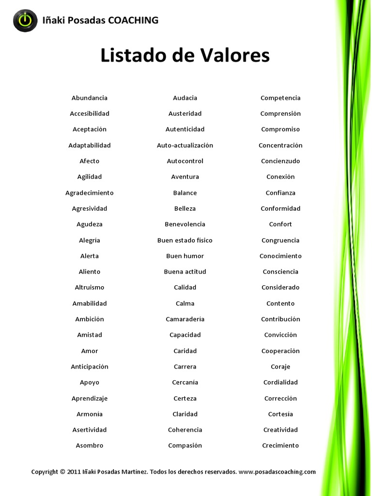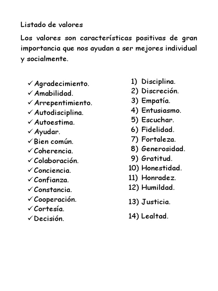 Lista De Valores - A continuación encontraras una lista de los valores más importantes, la cual estará agrupada por categorías, ya que estos elementos tienen.