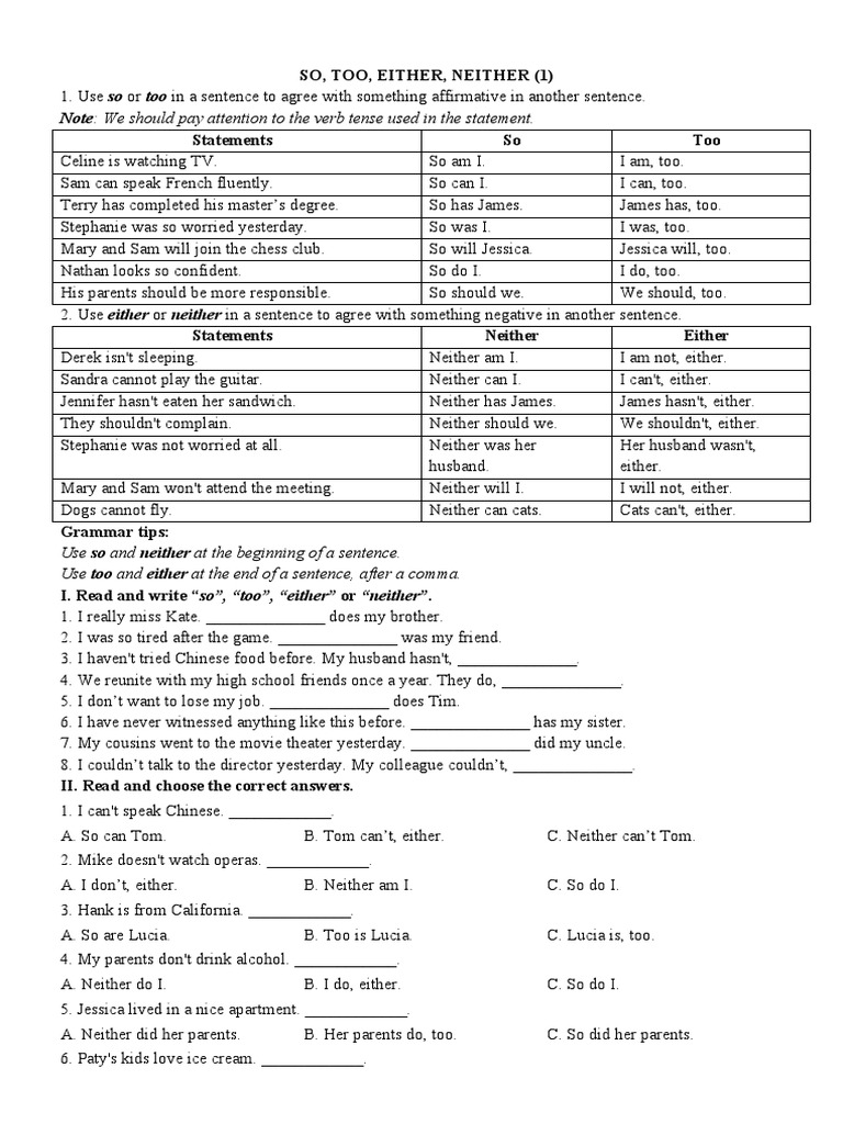 So, Too, Either, Neither PDF