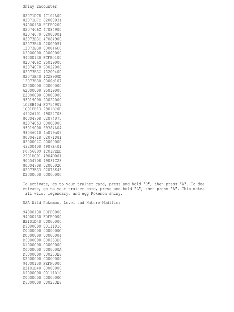 Pokemon Platinum Action Replay Codes PDF Nintendo Pokémon