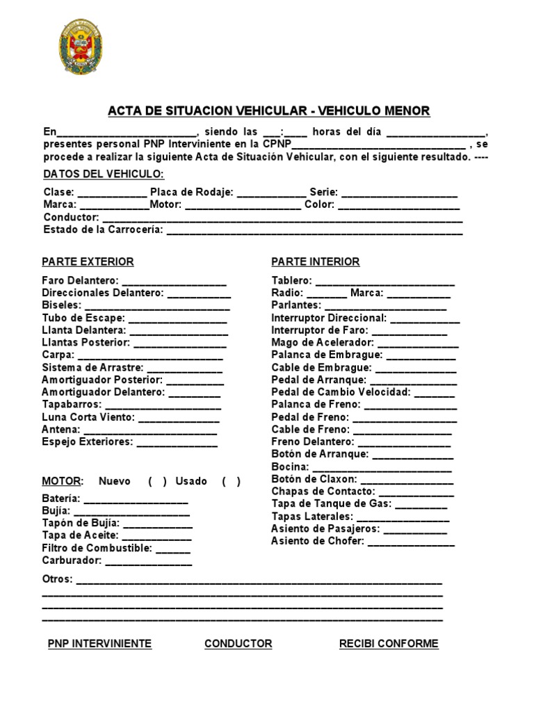 Acta de Situacion Vehicular Vehiculo Menor Formato PDF Bienes