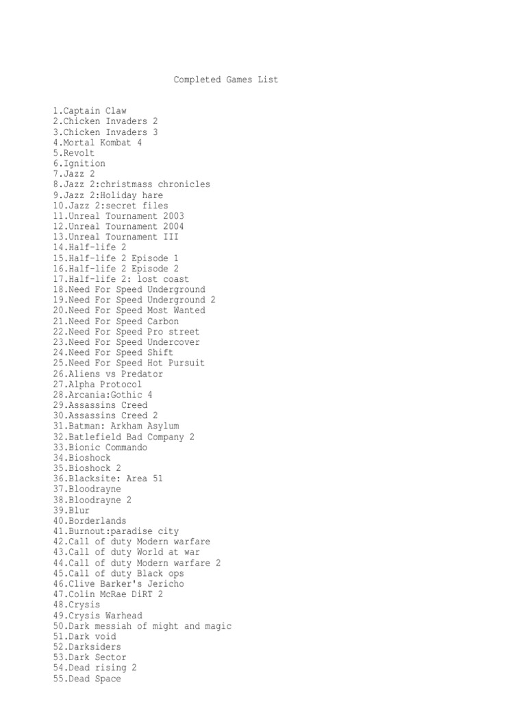 Completed Games List. PDF Video Game Franchises Video Games
