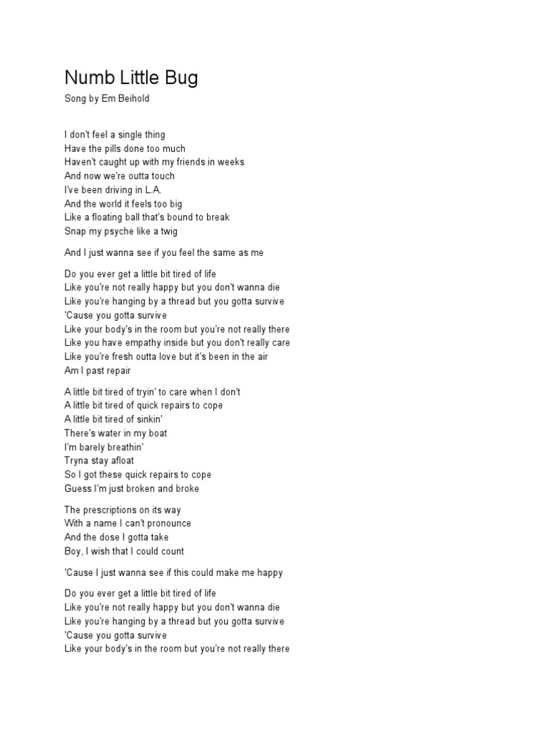 Discover songs like numb little bug by lucifer and generate your dream playlist on chosic! As much as the two songs really sound alike, i don’t think it’s the one. There's a song that i swear that sounds similar to numb little bug by em beihold and i thought it was by jukebox the ghost but maybe someone. I'm just.